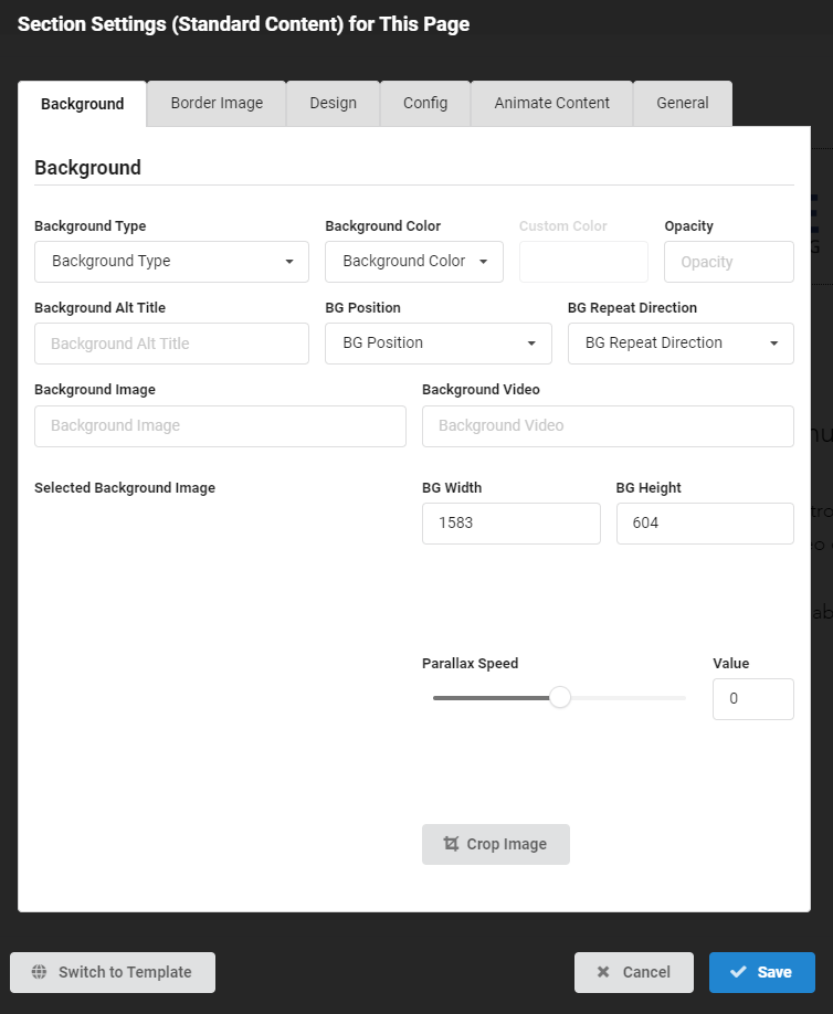The Section Settings dialog box is used for configuring the design, functional, and layout properties of an individual section. It is divided into a series of tabs with related settings grouped together, the first of which is usually the Background tab. In most cases, this section is for advanced users who are manipulating the design of the section, however some special section types have configuration elements that can be changed. Examples include a special donate form that can have its email recipients and email subject changed according to a particular featured event, or a mailing list subscription form that is connected to a service like Constant Contact or MailChimp.