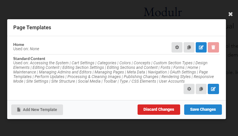 How to locate, edit, or duplicate page templates. Page templates consist of "Standard Content" boxes.