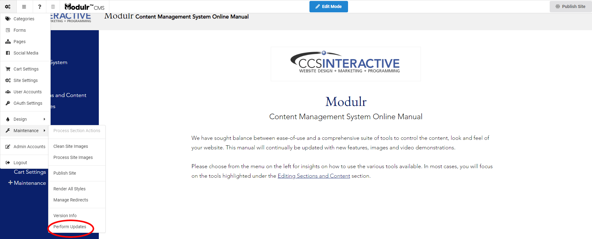 How to Perform Updates for syncing the CMS with the latest updates. A good starting point if you are experiencing "bugs" or issues that may have already been resolved in a later version.