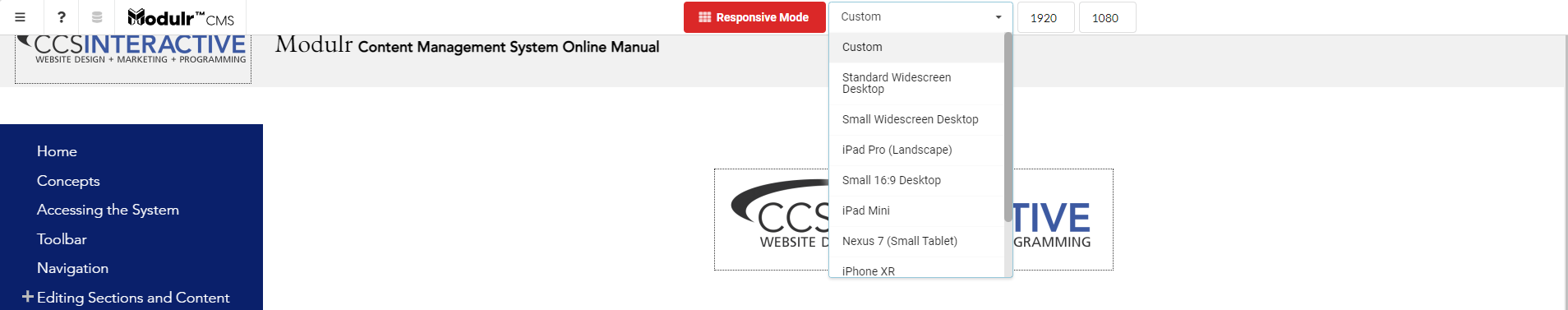 Once activated, you can choose from various preset devices or customize a screen size. The system will display your website as though it were on that screen size so that you can preview the layout and make changes as desired.